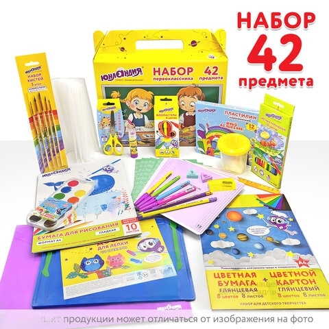 Набор школьных принадлежностей в подарочной коробке ЮНЛАНДИЯ "НАБОР ПЕРВОКЛАССНИКА", 42 предмета, 880118