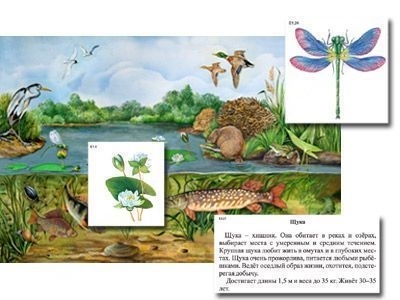 - плакат с изображением участка пресного водоема с растениями и животными прибрежной зоны – 1 шт.,