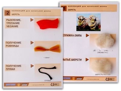 Коллекция поставляется в картонной коробке. Образцы шерсти, пряжи, нитей и тканей размещены на картонных ламинированных планшетах. Сопровождаются краткими пояснениями технологии переработки шерсти.