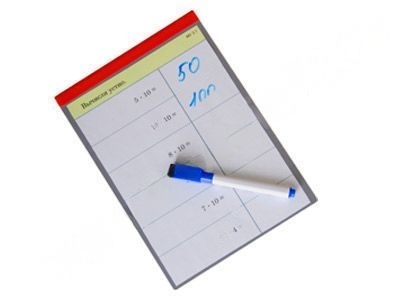 Планшет размером 150*210 мм изготовлен из пластика. На лицевой стороне планшета закреплена пленка, под которую может помещаться карточка с заданиями. Ответы записываются на пленке маркером на водной основе. Надписи можно стирать специальным ластиком, закрепленным в колпачке.