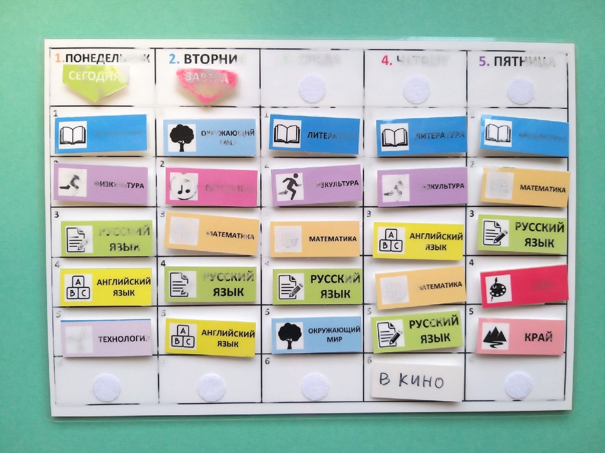 Карточки с названиями уроков закрепляются при помощи липучек. Слова соседствуют с пиктограммами, чтобы ребенок не запутался и смог натренировать зрительную память. У каждого названия своя маркировка цветом, что способствует быстрому усвоению информации, легкой классификации учебных часов по тематике, стимулирует цветоразличение.