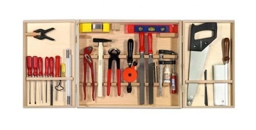 Все миниатюрные предметы, служащие для детей орудием труда, укладываются в специальный ящик с замочком. Дошкольники смогут без вреда для здоровья учиться работе с деревянными заготовками, создавая собственные шедевры и приучаясь к дисциплине.