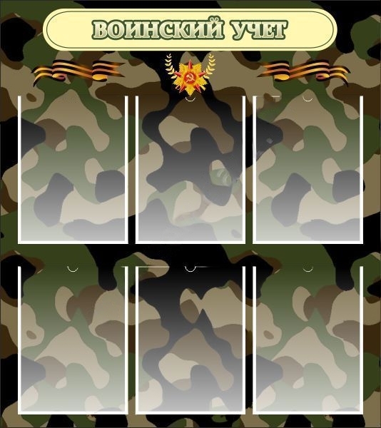 Камуфляжный цвет фона, несомненно, привлечет внимание будущих призывников, не отвлекая от содержания информации на стенде. Рекомендуется к размещению в кабинетах ОБЖ и НВП средних общеобразовательных учреждений.