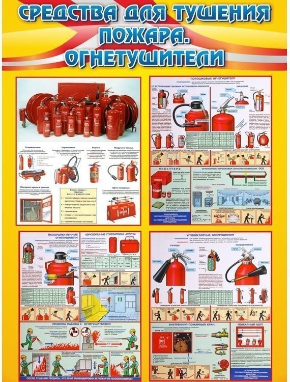 Стенд содержит полную информацию о правилах использования средств пожаротушения, а также яркие, красочные иллюстрации.