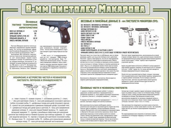 На стенде представлена информация о тактико-технических характеристиках пистолета Макарова, его устройстве и о том, как осуществляется работа деталей и механизмов.