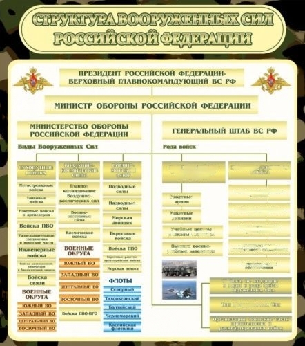На стенде в виде схемы представлена информация о структуре вооруженных сил РФ. Указаны виды ВС и роды войск, которые входят в состав вооруженных сил РФ, а также степень их значимости.