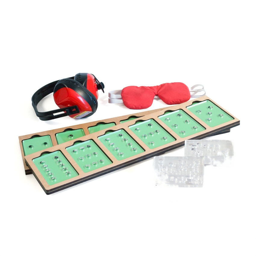 Комплект применяется с дополнительной когнитивной нагрузкой: выстраивание последовательностей, счёт, сравнение. Проводить упражнения можно как при полном сенсорном контроле, так и при условно-изолированном тактильном канале.