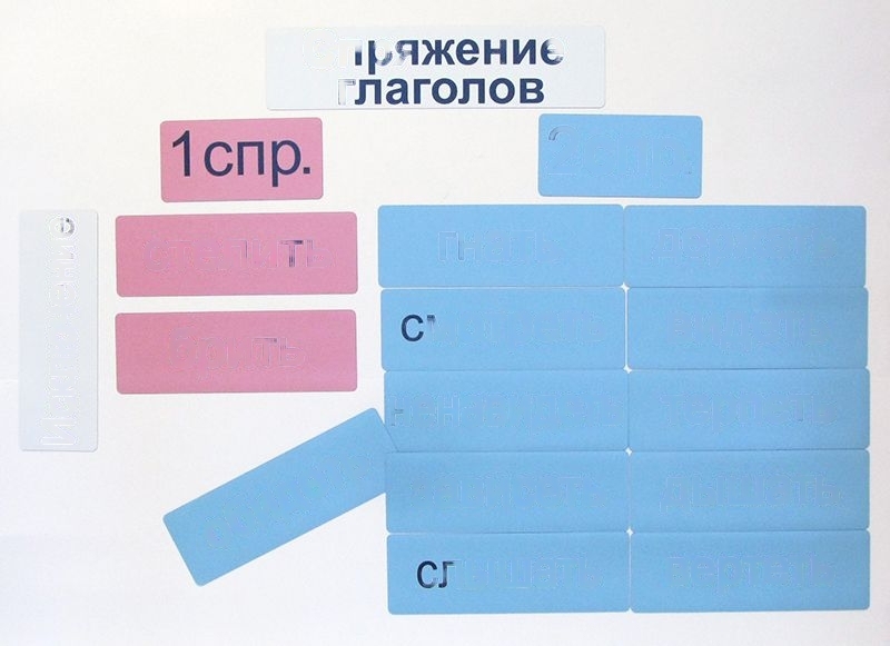 Предназначен для изучения спряжения глаголов. Карточки для двух спряжений отличаются по цвету. С использованием набора можно выполнять задания на доске, проводить различные игры в рамках урока.