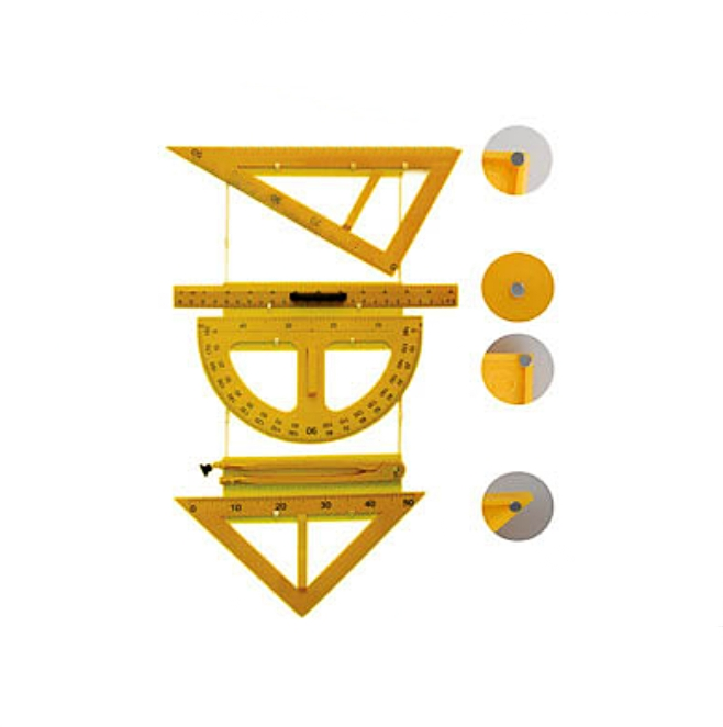 Комплект предназначен для линейных измерений и вычерчивания мелом различных чертежей, схем и рисунков на классной доске. Инструменты изготовлены из пластмассы и снабжены удобными ручками и магнитами для крепления к доске.