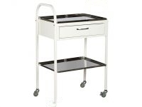 Столик с фурнитурой легко передвигается благодаря наличию боковых ручек в виде загнутых труб. Мебель служит для хранения и доставки медикаментов, приборов, инструментов.