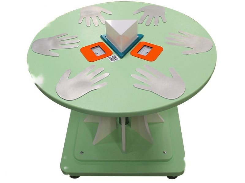На столешнице стилизованного основания закреплено 6 пластинок в форме ладони человека. Металлические пластины и микроамперметры составляют последовательную цепь, дополненную световыми индикаторами. Установка рассчитана на 3-х учащихся, их руки замыкают цепочку.