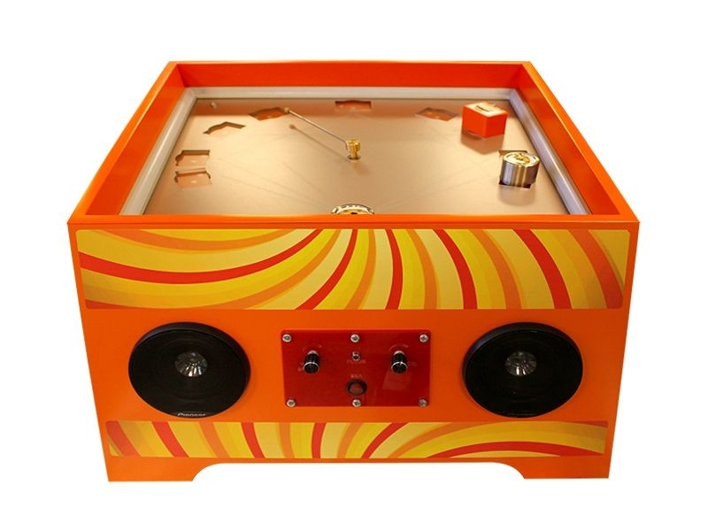 Внутри кубической конструкции закреплена барабанная палочка, которая во время вращения ударяется об ячейки с цилиндрами и брусками.