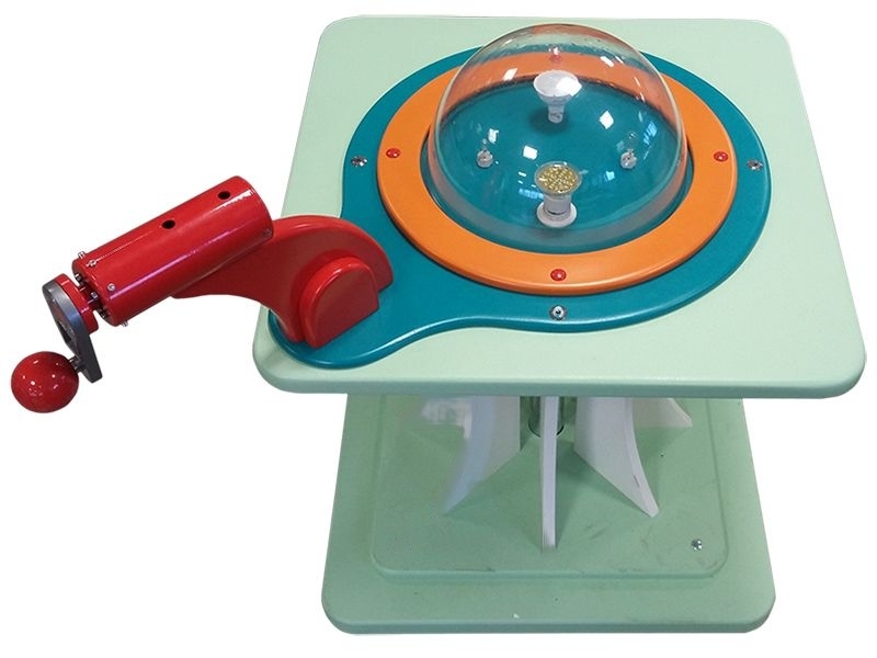 На декоративном основании закрепляются лампы неодинаковой мощности, защищенные куполом, и генератор. Ручка генератора вращается, вырабатывается электричество. С возрастанием мощности для питания нагрузок ручку крутить тяжелее.