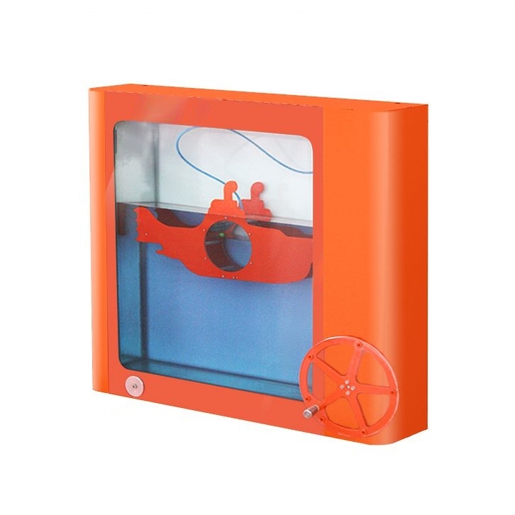 Через стекло на лицевой панели видна имитация подлодки над балластной цистерной с жидкостью. Модель подводного аппарата поднимается или опускается при помощи рычага, балластная цистерна при этом наполняется или опустошается.
