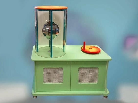 Модель небесного тела представлена сферой, которая для безопасности вмонтирована в цилиндр. Путем раскручивания ручки экспонат приводится в движение, имитируя вращение планеты. Шарообразная сфера меняет форму по мере наращивания скорости.