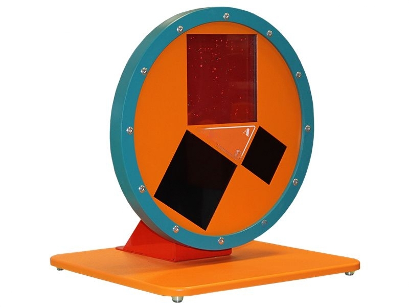 На декоративном основании закреплен вращающийся диск. Внутри диска находятся сосуды в форме параллелепипедов. Их стороны соприкасаются углами и образуют треугольник. Показано, что площадь квадрата, построенного на гипотенузе, равняется сумме площадей квадратов, построенных на катетах.