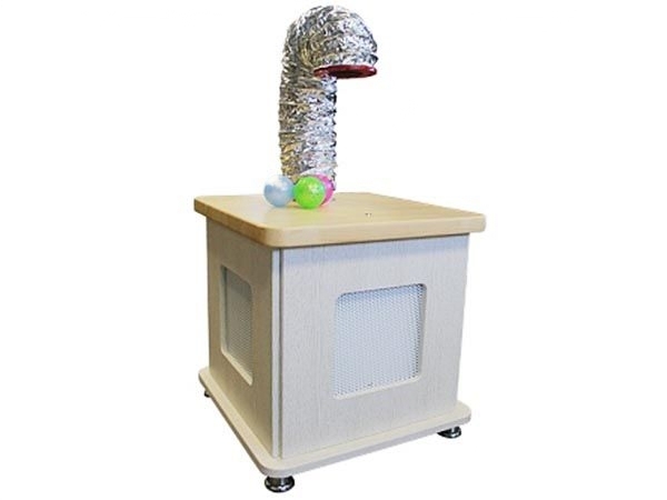 В тумбу встроен канальный вентилятор, наружу выходит труба Г-образной формы. Для наблюдения явлений используются цельные и перфорированные шарики.