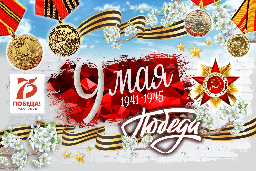 На стенде изображены атрибуты праздника: георгиевская лента, ордена, весенние цветы и надписи «9 мая», «1941-1945», «Победа! 1945-2020».
