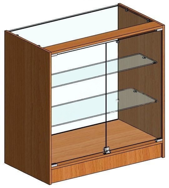 Прилавок с застекленным боксом поставляется разобранным. Высота прозрачной части корпуса 804 мм. 2 съемные полки, глубиной 300 мм и 20 мм, из стекла выдержат распределенную нагрузку до 7 кг. Нижняя горизонтальная поверхность, боковые стенки и часть крышки выполнены из ЛДСП. 2 распашные стеклянные дверцы запираются на замок.