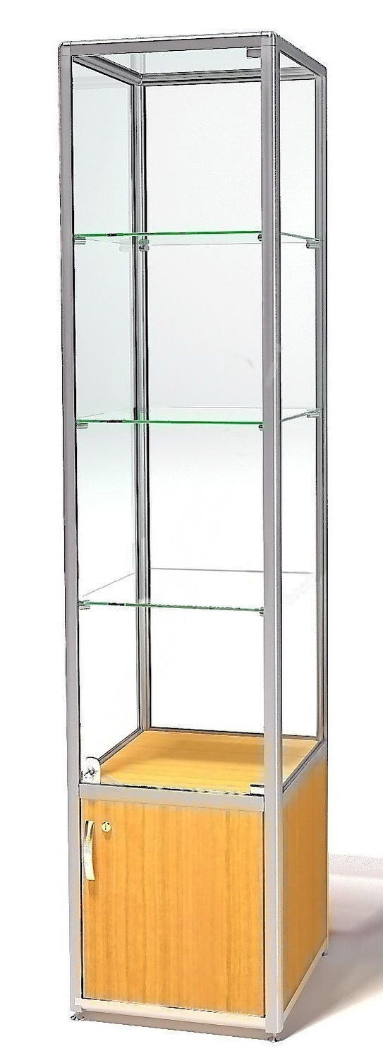 Витрина-пенал внизу оснащена зоной хранения. Основание прямоугольное. Наверху застекленный модуль с 3-мя полками. Также есть 2 дверцы с замками.