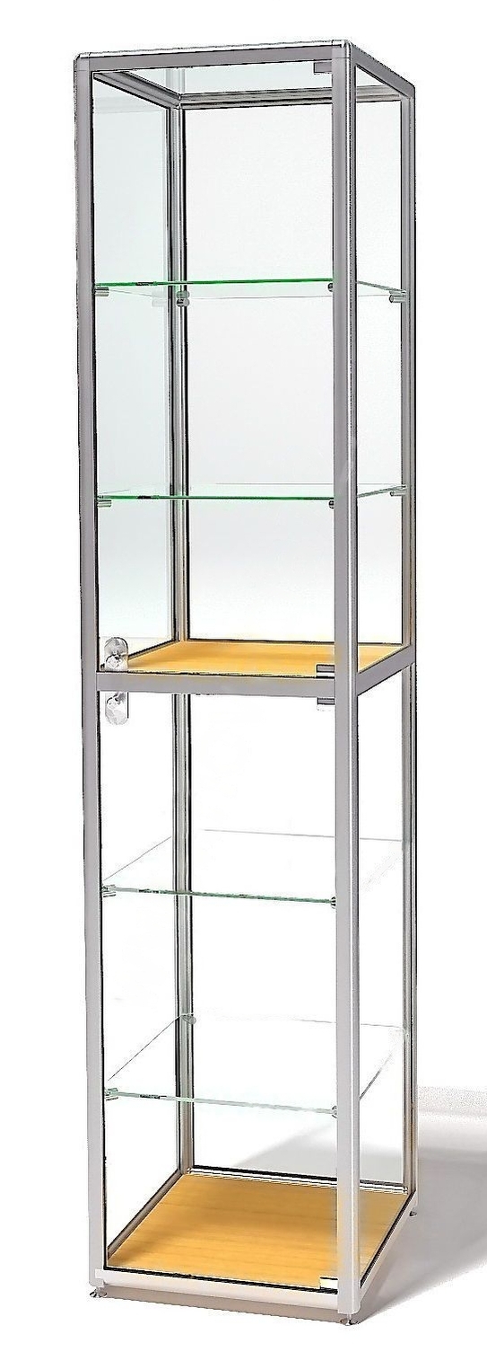 В прозрачной демонстрационной витрине 2 яруса. Каждый оснащен 2-мя полками из стекла и дверцей с замком.