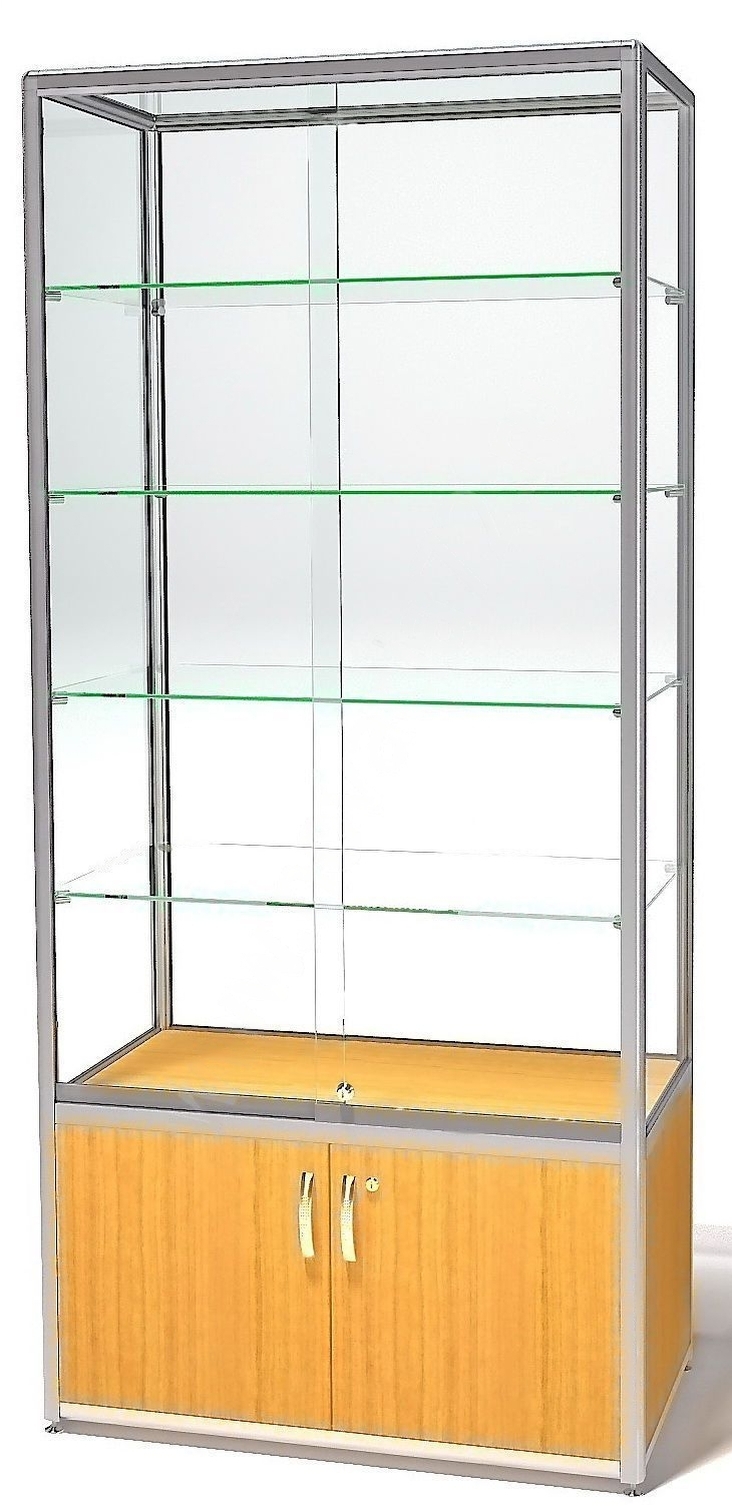 Витрина оснащена накопителем и верхним демонстрационным модулем. Обвязка профильная, металлическая. В модуле 4 стеклянных полки за прозрачными раздвижными дверцами с замком. Здесь можно раскладывать образцы для показа.