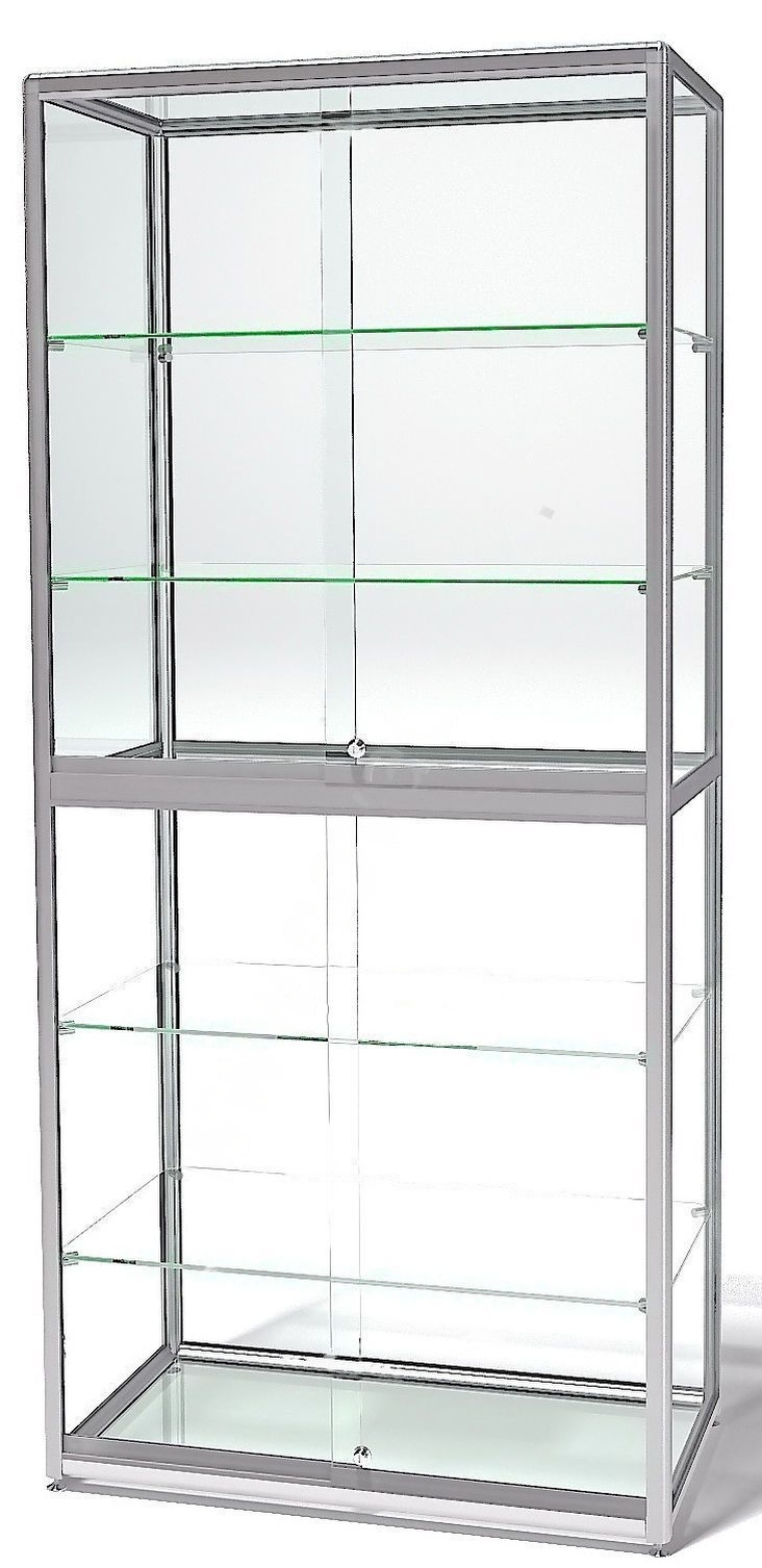 Витрина с профильной обвязкой состоит из 2-х остекленных ярусов. В каждом по 2 прозрачные полки. 2-хстворчатые раздвижные дверцы обоих ярусов запираются на замок.
