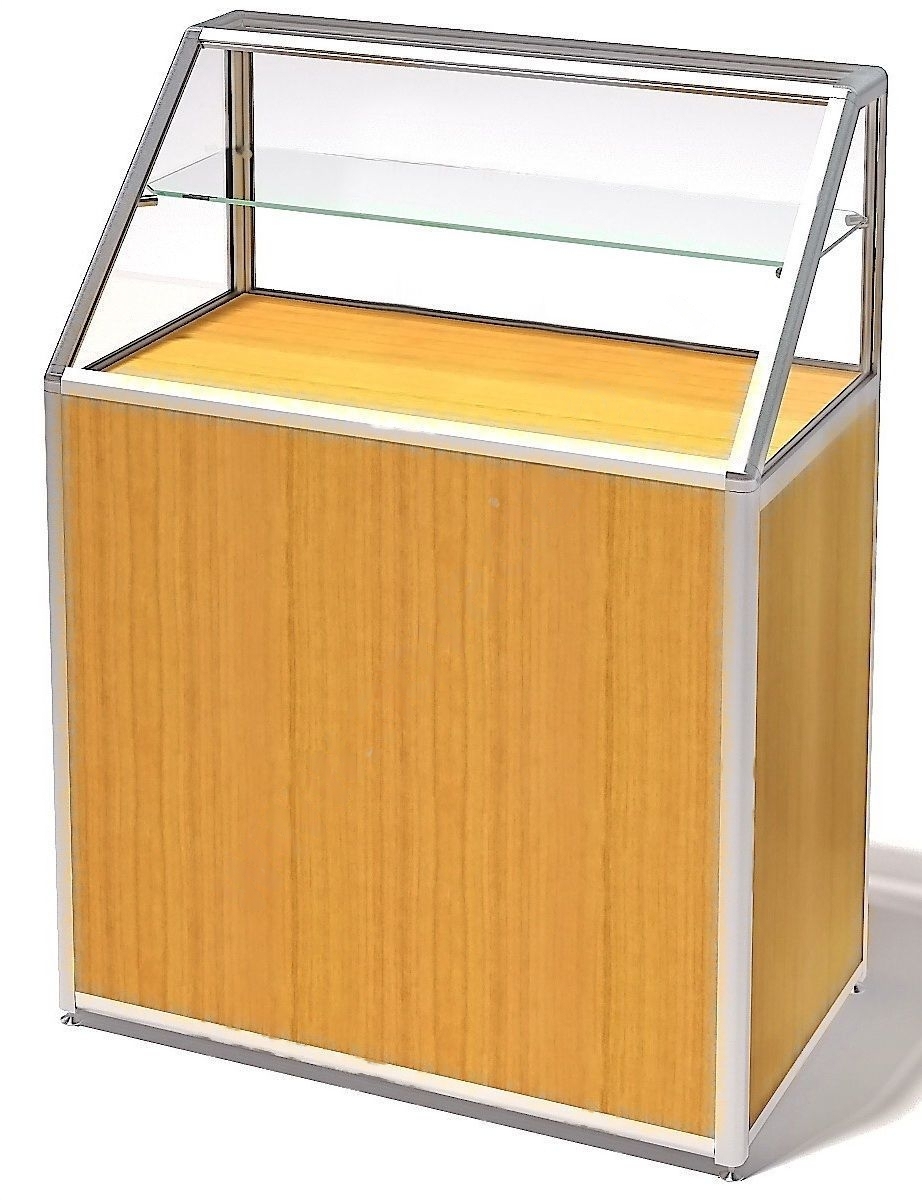 Витрина состоит из глухой нижней части и прозрачного отсека с наклонным фасадом.