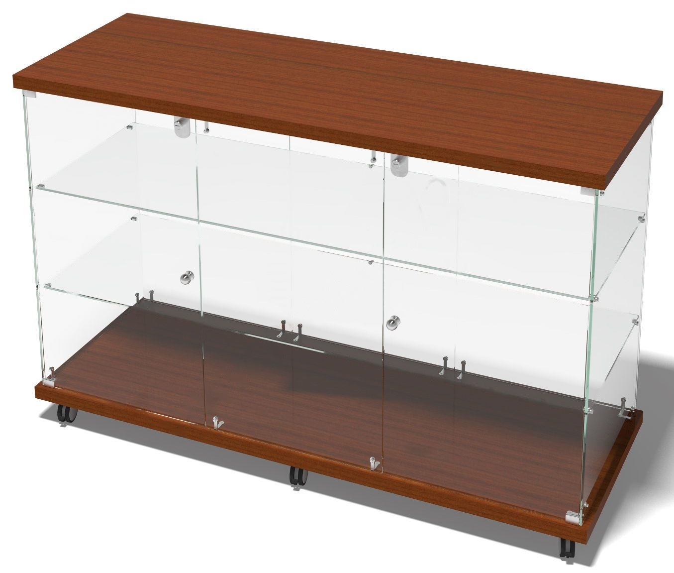 Витрина в прямоугольном корпусе дополнена 2-мя дверками. За прозрачным фасадом 3 отделения. Крышка и основание изготовлены из ЛДСП, остальные элементы стеклянные (марка М1).