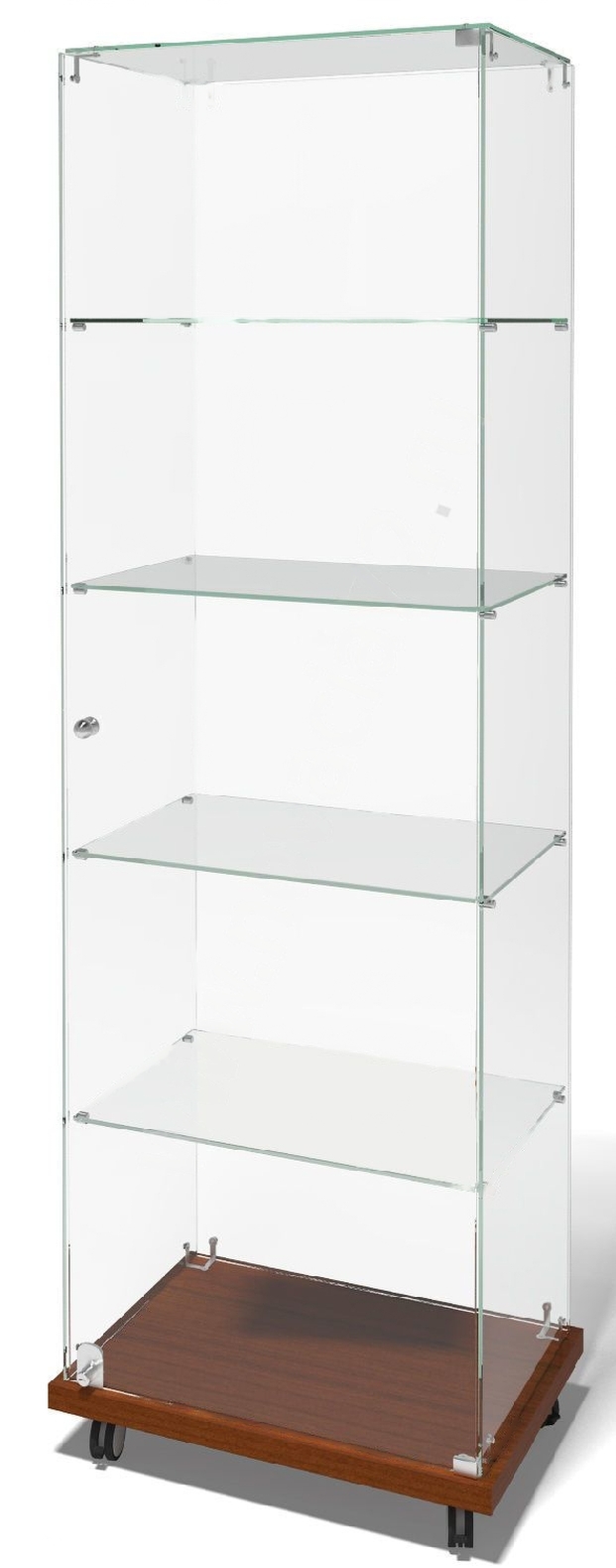 В мебели для хранения и выставок 4 полки, дверца с замком, крышка и боковые стенки из стекла марки М1. Пенал стоит на прямоугольном основании из ЛДСП.