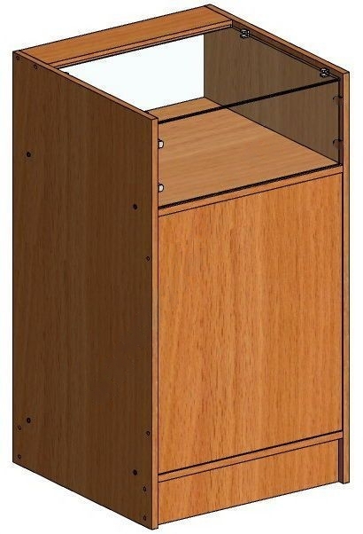 Верхняя секция оснащена стеклянной передней стенкой (h 200 мм) и частично стеклянной крышкой. Нижняя секция с глухим фасадом не имеет задней стенки. Ниша на оборотной стороне служит отсеком для хранения. С помощью отверстий можно закреплять дополнительные полки.
