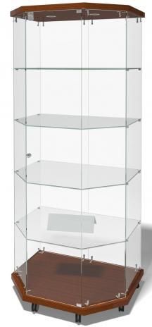 Витрина с 6-угольным основанием и фризом из ЛДСП дополнена стеклянными полками и дверцей с замком.
