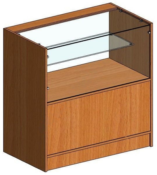 Нижняя часть служит для хранения предметов. Отделение без задней стенки скрыто за глухим фасадом. Выше расположен отсек с 1 полкой для выставок. В нем можно размещать образцы пособий, поделки, медали. Фасад и полка, глубиной 300 мм, стеклянные. Максимальная распределенная нагрузка на полку 7 кг.