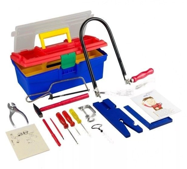 Набор инструментов для деревообработки позволяет проводить занятия с детьми младшего школьного возраста. Разноцветный ящик, в котором хранятся инструменты, поделен на отсеки, что помогает сортировать предметы в зависимости от габаритов. В ходе работы с набором дети учатся порядку, осваивают классификацию, улучшают моторику и координацию.