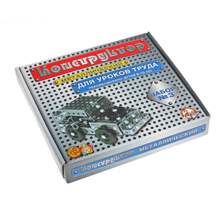 В наборе шкивы, крюки, гайки, винты, планки, пластины. Приводится схема сборки 5-ти моделей (2 машины, коляска, самолет, кран).