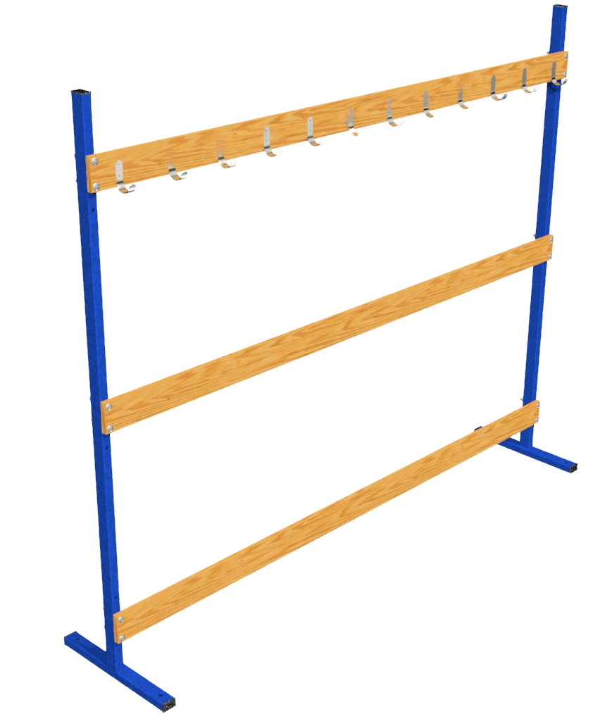 Металлический каркас выполняется из трубы прямоугольного сечения. Боковые стойки соединяются поперечными перекладинами из фанеры. Верхняя перекладина оснащается металлическими крючками (10 шт.) для закрепления лыжных палок.
