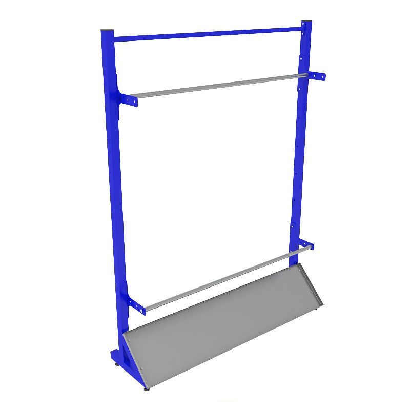 Полки и средняя планка подстраиваются под несколько размеров лыж. Тумба покрывается порошковой краской.