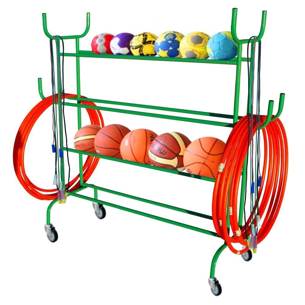 Стеллаж состоит из 3-х уровней (полочек), предназначенных для хранения разного вида мячей. Для подвешивания канатов и обручей по бокам конструкции представлены 8 крючков (по 4 с каждой стороны). Для облегчения передвижения стеллаж установлен на 4 поворотных колеса.
