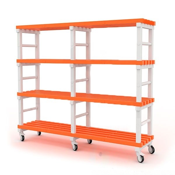 Мебель подходит для помещений с повышенной влажностью, уличных площадок. Материал не боится перепадов температур. В 2-хсекционном стеллаже хранится спортинвентарь. Предусмотрено 4 полки. На перекладинах боковых стоек развешиваются аксессуары.