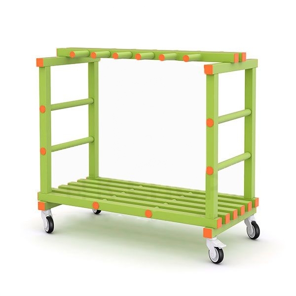 Конструкция подходит для хранения аквапоясов и других водных аксессуаров. Между боковыми стойками закреплены перекладины. Внизу полка из реек, наверху 2 рейки с вешалками (по 6 шт. на каждой стороне). Материал устойчив воздействию влаги. На торцах труб прямоугольного и круглого сечения заглушки.