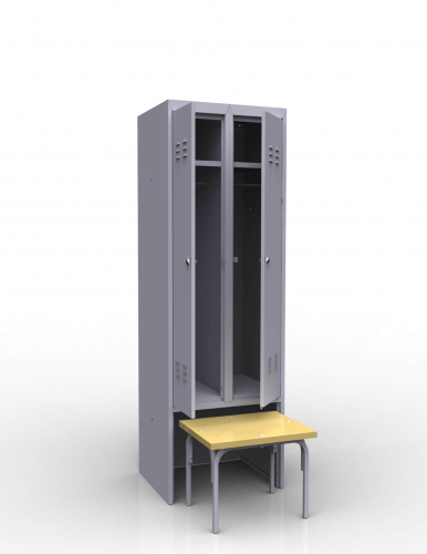 Разборный шкаф со скамьей подходит для спортивной раздевалки. Средний срок службы мебели составляет 15 лет.
