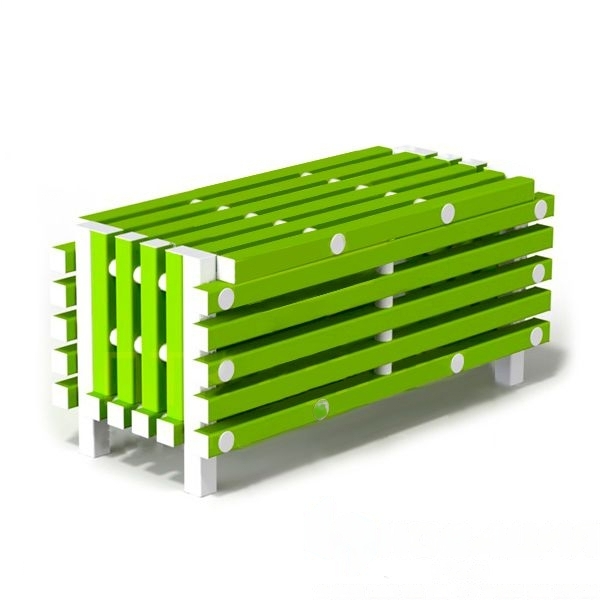 Скамья на каркасе из реек служит сиденьем и ящиком для спортинвентаря. Под съемной крышкой прямоугольная ниша, в которую поместятся мячи, скакалки или другие аксессуары.