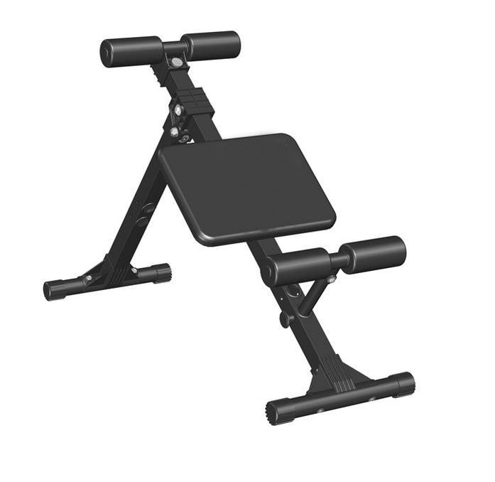 Оборудование оснащается валиками для закрепления ступней ног. Торцевые опоры подстраиваются под неровности пола. Угол наклона тренажера составляет 42 градуса.