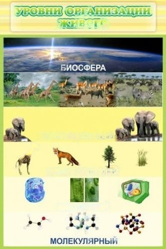 На стенде отражены уровни живого: молекулярный, клеточный, организменный, популяционный, биоценоз и биосфера. Каждый уровень сопровождается иллюстрациями.