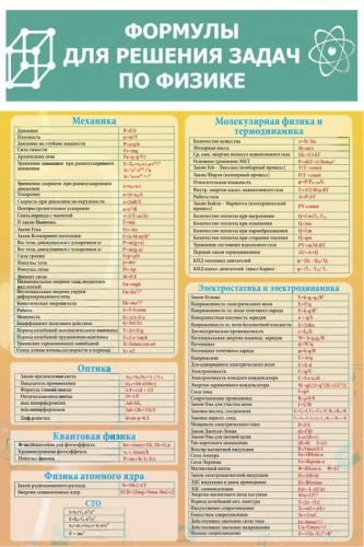 Стенд содержит формулы, которые используются для решения задач в различных разделах физики. Может использоваться как подсказка во время проведения уроков.