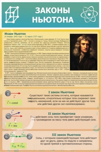 Стенд есть цветной портрет Исаака Ньютона и информация о нем, а также формулировки законов с сопровождающими схемами.