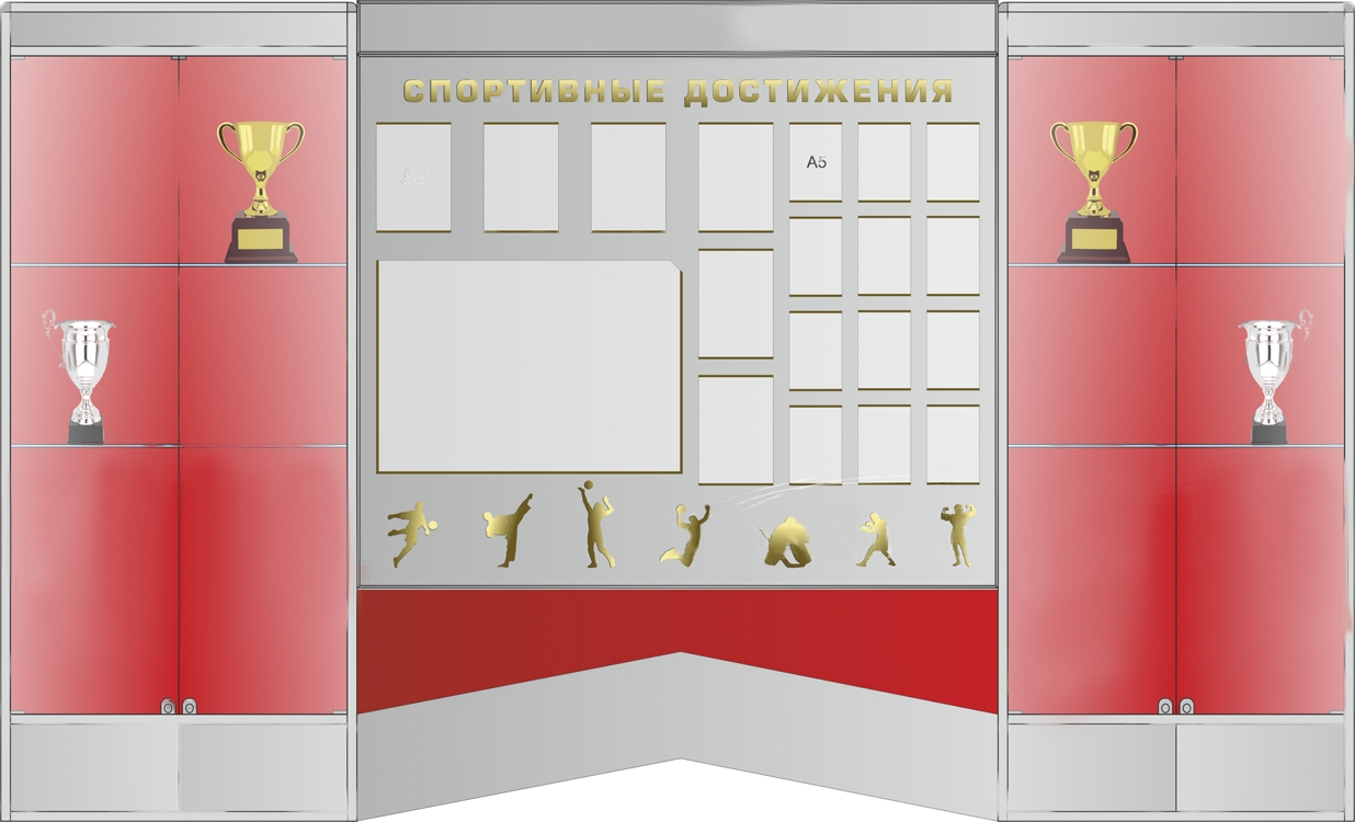 Композиция подходит для демонстрации спортивных достижений коллектива. Набор состоит из 2-х модулей витрины и стенда с карманами.