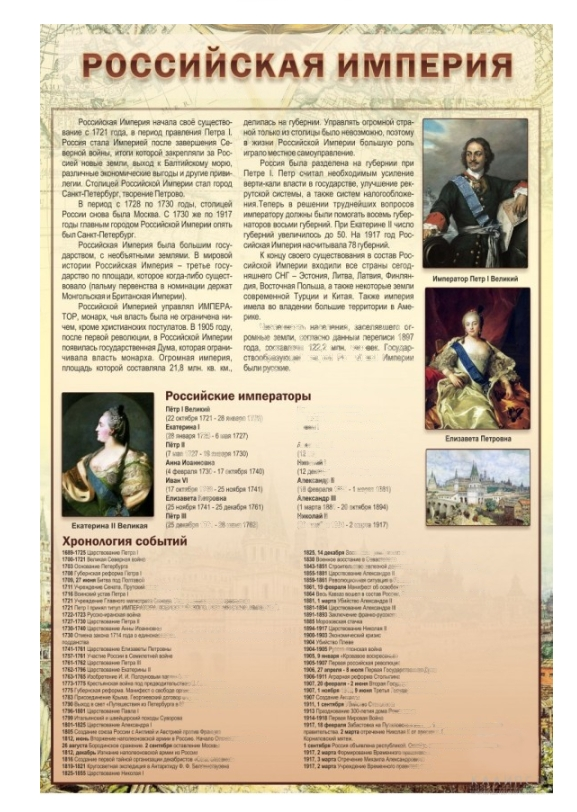 На предлагаемом стенде представлена краткая хронология событий в период с 1689 по 1917 гг. В верхней части стенда дана информация о данном историческом периоде. Приведены годы жизни великих российских правителей, а также их портреты.