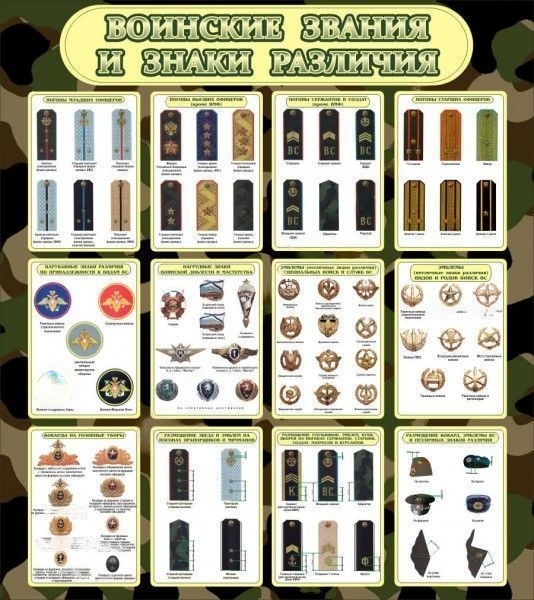 На красочном информационном поле, разделенном по темам, изображены погоны, шевроны и кокарды представителей ВС РФ с подписями.