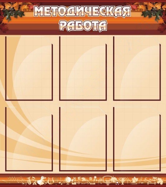 Стенд выполнен в бежево-коричневой гамме. Использование стенда позволит сделать всю необходимую информацию по методической работе доступной как учащимся, так и учителям. Информационные листы можно расположить в вертикальных карманах формата А4, которые крепятся на двусторонний скотч.